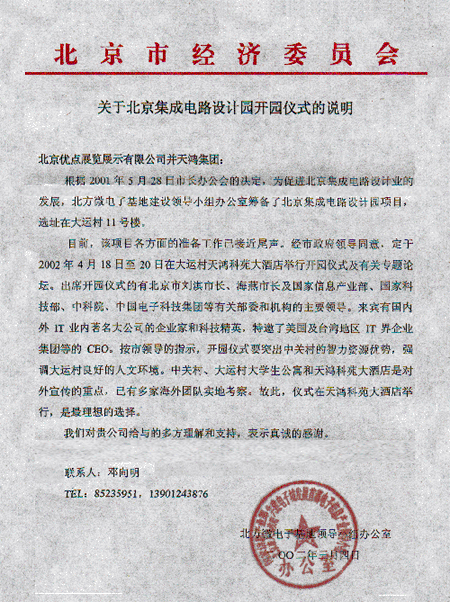本次大會(huì)組委會(huì)及會(huì)議舉辦地點(diǎn)“天鴻科園大酒店”日前接到北京市人民政府通知,由于“北京集成電路設(shè)計(jì)園開園儀式”將于2002年4月18日至4月20日在大運(yùn)村、天鴻科園大酒店舉行開園儀式及相關(guān)活動(dòng),屆時(shí)將有北京市劉淇市長、海燕市長及國家信息產(chǎn)業(yè)部、國家科技部、中科院、中國電子科技集團(tuán)等有關(guān)部委和機(jī)構(gòu)的主要領(lǐng)導(dǎo)出席。按市領(lǐng)導(dǎo)指示,為配合此次重大活動(dòng)圓滿舉行,“首屆呼叫中心運(yùn)營管理研討會(huì)”日期更改為2002年4月23日至4月25日在北京天鴻科園大酒店舉行,望有關(guān)參會(huì)單位做好相應(yīng)的后續(xù)工作。特此通告!