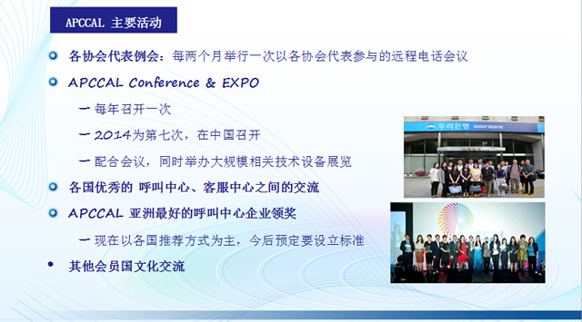 為了亞洲各國的與呼叫中心、客服中心相關的產業(yè)信息的共享和通過實質性的交流,以更好的相互發(fā)展各會員國的呼叫中心、客服中心產業(yè)為目的。