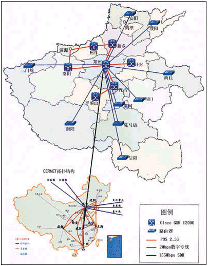 河南省教育科研計算機網(wǎng)(HERNET)作為中國教育科研計算機網(wǎng)絡(luò)(CERNET)在河南的省級網(wǎng)絡(luò),提供河南省的教育與科研機構(gòu)的Internet接入。在CERNET業(yè)已發(fā)展成為中國第二大互聯(lián)網(wǎng)的今天,各省教研網(wǎng)的建設(shè)變得尤為重要,河南省在2001年啟動“教育信息化年”規(guī)劃后,多方合作,采用思科系統(tǒng)(中國)網(wǎng)絡(luò)技術(shù)有限公司的高端網(wǎng)絡(luò)設(shè)備,將原來骨干帶寬僅為2M的教育科研網(wǎng)升級到2.5G,順利實現(xiàn)了教育科研網(wǎng)絡(luò)應(yīng)用的飛躍性進步,并且真正實現(xiàn)了“三網(wǎng)合一”。