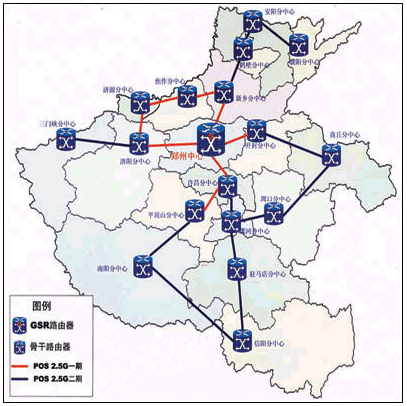 HERNET一期工程主干網(wǎng)采用IP POS技術(shù),應(yīng)用AVVID網(wǎng)絡(luò)體系結(jié)構(gòu),采用骨干傳輸網(wǎng)、城域網(wǎng)、接入網(wǎng)三層設(shè)計方案,以省網(wǎng)絡(luò)中心(設(shè)在鄭州大學(xué)網(wǎng)絡(luò)中心)、地市網(wǎng)絡(luò)中心、校園網(wǎng)三級管理模式。由省網(wǎng)絡(luò)中心向下以2.5G速度連接到各地市網(wǎng)絡(luò)中心,而向上則以155M速度連接到CERNET及Internet。整個一期工程實現(xiàn)了包括鄭州、許昌、平頂山、開封、洛陽、濟源、焦作以及新鄉(xiāng)等7個地市的2.5G連接,并形成了一個環(huán)網(wǎng)狀冗余拓撲結(jié)構(gòu),確保當(dāng)網(wǎng)絡(luò)的一個節(jié)點出現(xiàn)問題時,數(shù)據(jù)可以通過其他途徑傳輸?shù)侥康牡,在一期工程完成后,?0多所大學(xué)、中小學(xué)等教育與科研單位以千兆速度連接到HERNET上,共有近50萬的用戶能夠充分利用高速帶寬獲得教育網(wǎng)資源。