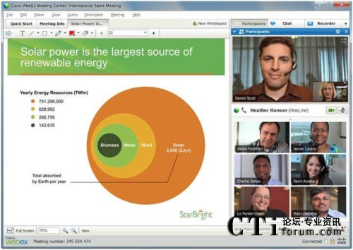 隨著支持高質(zhì)量視頻的思科WebEx™ Meeting Center的推出,與會(huì)者將能夠在全屏視頻模式下非常清晰的看到其他與會(huì)人員,從而使網(wǎng)絡(luò)會(huì)議變成一個(gè)虛擬視頻會(huì)議室。除了能夠通過(guò)高清晰度的全屏顯示看到發(fā)言者外,用戶還能同時(shí)共享桌面,并通過(guò)思科的 WebEx One Touch輕松接入思科網(wǎng)真會(huì)議。思科WebEx還提供ActivePresence功能,可沿屏幕底部以條狀顯示所有與會(huì)者。當(dāng)前的發(fā)言者以全屏顯示,并保持與參會(huì)者之間的視頻交互。借助語(yǔ)音激活轉(zhuǎn)換功能,當(dāng)另一個(gè)與會(huì)者開始發(fā)言時(shí),他將被轉(zhuǎn)為全屏顯示狀態(tài)。思科網(wǎng)真終端也支持ActivePresence功能。
