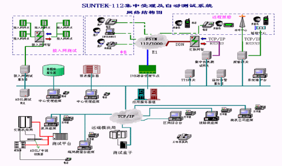 系統(tǒng)在設(shè)計(jì)時(shí)采用集中受理、分布測量的結(jié)構(gòu)化、模塊化設(shè)計(jì):受理中心進(jìn)行112的集中受理和業(yè)務(wù)處理,端局完成相應(yīng)用戶線的測試功能,所有測試數(shù)據(jù)等均送至受理中心。系統(tǒng)測試準(zhǔn)確、任務(wù)分擔(dān)、負(fù)荷均衡,處理速度快,性能可靠。系統(tǒng)的受理模塊和測試模塊相互協(xié)調(diào)又各自獨(dú)立,使二者可以統(tǒng)一地作為SUNTEKTM-112集中受理及自動(dòng)測試系統(tǒng),又能各自作為子系統(tǒng)與其它廠家(112系統(tǒng)、97系統(tǒng)、1000號(hào)等)的產(chǎn)品結(jié)合起來為112系統(tǒng)服務(wù)。系統(tǒng)網(wǎng)絡(luò)結(jié)構(gòu)圖如下所示: