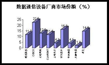 。1)市場規(guī)模: 年初各大運營商IP實驗網(wǎng)的開通以及聯(lián)通覆蓋300余城市的IP網(wǎng)絡大規(guī)模建設,年中ChinaNet大提速與3期擴容項目實施以及CNCnet開通,年末CMnet骨干網(wǎng)一期工程上馬、2000年中國數(shù)據(jù)通信設備市場可謂是熱點頻仍。根據(jù)Frost&Sullivan分析,年內(nèi)網(wǎng)絡交換機、訪問產(chǎn)品、 路由器、集線器等數(shù)據(jù)通信主要設備市場規(guī)模達到96億人民幣,同比增長36%,數(shù)據(jù)通信設備市場再次進入高速增長期。
