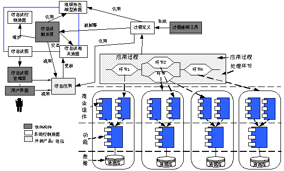 一體化信息平臺(tái)的總體結(jié)構(gòu)大體上分為數(shù)據(jù)層、功能、商業(yè)組件、處理環(huán)節(jié)、應(yīng)用過程層,功能層提供基本的基礎(chǔ)功能和商業(yè)功能元件,商業(yè)組件封裝了相關(guān)的數(shù)據(jù)和功能元件,可以被客戶關(guān)系管理系統(tǒng)各環(huán)節(jié)調(diào)用,通過以客戶為中心的信息流管理控制順序執(zhí)行處理環(huán)節(jié),實(shí)現(xiàn)商業(yè)過程。