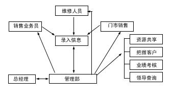 根據(jù)英普的業(yè)務管理模式,公司將門市銷售、維修部、大客戶部的業(yè)務管理工作,交由管理部全部管理和協(xié)調(diào),這三個部門將各自與客戶接待、交往過程、工作計劃全部明細記錄,交由管理部確認,管理部在保證必要保密的情況下,進行工作再分配,同時加強業(yè)務考核和其他管理職能工作。其業(yè)務流程如圖1。