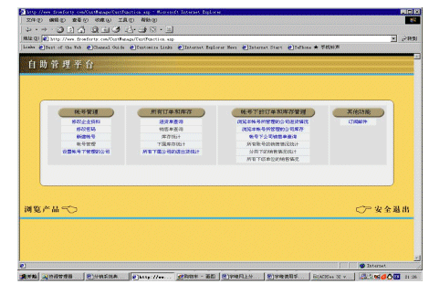 ebanswers分銷系統(tǒng)的一個(gè)重要特色就是自助管理平臺(tái),用戶可以在這個(gè)平臺(tái)中完成絕大部分管理、查詢和統(tǒng)計(jì)的工作。自助管理平臺(tái)主要有四大部分組成:帳號(hào)管理、公司下訂單和庫(kù)存管理、帳號(hào)下訂單和庫(kù)存管理、其他功能。其中帳號(hào)管理主要是管理與公司和帳號(hào)有關(guān)的各類信息,公司下訂單和庫(kù)存管理、帳號(hào)下訂單和庫(kù)存管理這兩個(gè)部分主要是用來(lái)查詢和統(tǒng)計(jì)各項(xiàng)信息的。