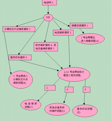 在交互式語音應(yīng)答系統(tǒng)IVR的幫助下,各服務(wù)流程有條不紊地進(jìn)行,每個(gè)職能部門管理自己部門的流程,提供全方位的客戶所要求的服務(wù)。下面我們以銷售咨詢?yōu)槔,看看這個(gè)簡單的工作流程。