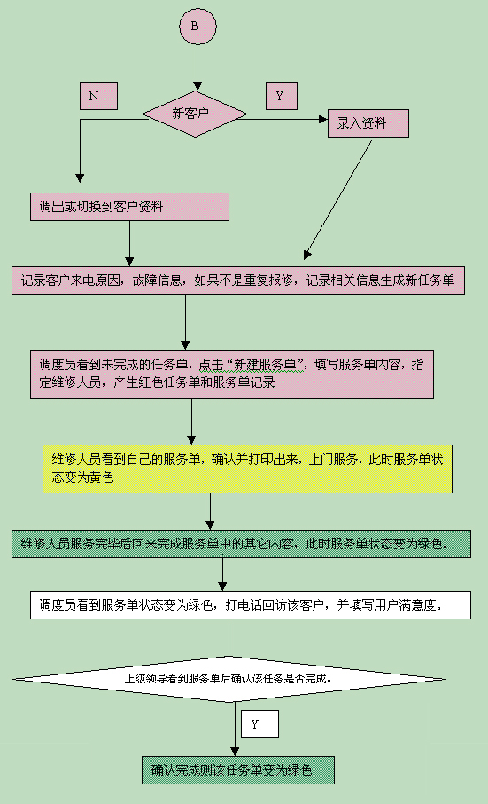 如果是需要上門維修的客戶,點(diǎn)擊"新建任務(wù)單",填寫任務(wù)單上的相關(guān)內(nèi)容,此時(shí)任務(wù)單狀態(tài)為紅色;調(diào)度員看到新任務(wù)單,點(diǎn)擊"新建服務(wù)單",填寫服務(wù)單內(nèi)容,指定維修人員。此時(shí)任務(wù)單狀態(tài)變?yōu)榧t色,服務(wù)單狀態(tài)則為紅色。維修人員看到自己的服務(wù)單,確認(rèn)并打印出來,上門服務(wù),此時(shí)服務(wù)單狀態(tài)變?yōu)辄S色;維修人員服務(wù)完畢后回來完成服務(wù)單中的其它內(nèi)容,此時(shí)服務(wù)單狀態(tài)變?yōu)樗{(lán)色;調(diào)度員看到服務(wù)單狀態(tài)變?yōu)樗{(lán)色,打電話回訪該客戶,并填寫用戶滿意度;上級領(lǐng)導(dǎo)看到服務(wù)單后確認(rèn)該任務(wù)是否完成。確認(rèn)完成則該任務(wù)單變?yōu)樗{(lán)色,否則再派出一張服務(wù)單。直到任務(wù)完成。