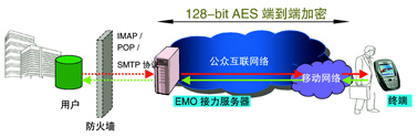 鑒于用戶目前正使用互聯(lián)網(wǎng)郵件系統(tǒng),愛立信提供了EMO Email Push互聯(lián)網(wǎng)版解決方案。方案需要將Email Push應(yīng)用的用戶在愛立信EMO接力服務(wù)器上注冊,同時在用戶的手機(jī)上安裝客戶端軟件即可;