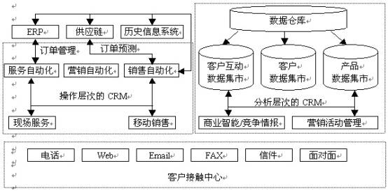 CRM作為一個應(yīng)用軟件系統(tǒng),它凝聚了市場營銷等管理科學(xué)的管理理念。市場營銷、銷售管理、客戶關(guān)懷、服務(wù)和支持等構(gòu)成了CRM軟件模塊基石。