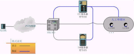 上圖是客服中心較常見的結(jié)構(gòu)圖,相當(dāng)于將初級(jí)客服的CT-Server服務(wù)器一分為三。原來的語音板卡由現(xiàn)在真正的PBX替代,青牛USE和青牛ATS則是從CT-Server軟件包中獨(dú)立出來,強(qiáng)化各自的核心功能,運(yùn)行在兩臺(tái)單獨(dú)的服務(wù)器上(IVR服務(wù)器還是需要語音板卡來處理話路,但語音板卡已經(jīng)不負(fù)責(zé)PBX的交換功能了)。這種類型的客服中心可以給客戶更大規(guī)模的、更穩(wěn)定的服務(wù),并且撥入電話的客戶感覺不到系統(tǒng)的變化。