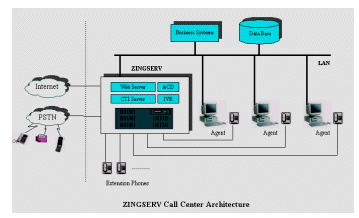 ZINGSERVò采用可靠性、安全性極高的嵌入式實時LINUX操作系統(tǒng)進行開發(fā)。系統(tǒng)軟件采用客戶/服務器結構,服務器集ACD(技能組)、IVR、CTI
