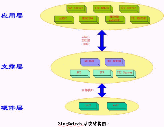 在以上三層結(jié)構(gòu)中,前兩層與具體業(yè)務(wù)系統(tǒng)無關(guān)。上層業(yè)務(wù)系統(tǒng)的多種變化,不會影響下層的穩(wěn)定;而下層規(guī)范地進行優(yōu)化和擴展后,上層的所有應用都可在業(yè)務(wù)功能上得到擴展。這樣,用戶的業(yè)務(wù)應用系統(tǒng)自身可以有多種功能和性能的變動和擴展,同時,當基于ZingSwitch一體化交換機的呼叫中心系統(tǒng)平臺在進行擴容、升級的時候,原來已經(jīng)無縫掛接其上的用戶的業(yè)務(wù)應用系統(tǒng)也無需任何更改即可運行。