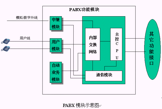PABX模塊采用了三級分布分散的控制方式,這三級由主控板級、通訊控制級和各功能模塊級組成。各功能模塊單板實現(xiàn)各功能板的自身控制,通訊控制級模塊主要負責主控板級和各功能模塊級之間的數(shù)據(jù)通訊,實現(xiàn)主控板對各功能模塊的協(xié)調(diào)和控制。模塊內(nèi)部采用了先進的內(nèi)存管理技術(shù)、先進的通信方式和先進的控制方式,因而獲得了極高的CPU通訊帶寬和處理能力。