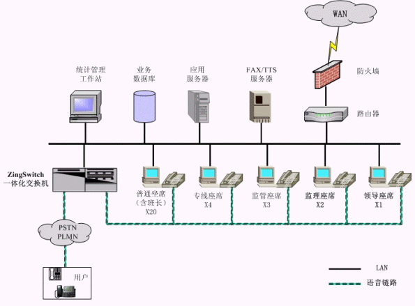 系統(tǒng)配置一套英立訊的ZingSwitch一體化交換機(jī),集成提供了包括PABX、ACD、CTI Server、IVR Server、實(shí)時(shí)錄音等功能,同時(shí)配置外掛的傳真服務(wù)器。同時(shí),系統(tǒng)根據(jù)需求配置相應(yīng)數(shù)量的各種座席和統(tǒng)計(jì)管理工作站等。