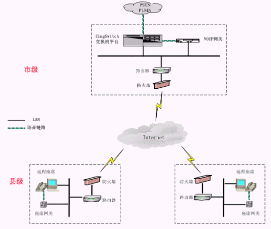 系統(tǒng)在市中心點(diǎn)和分布的遠(yuǎn)程座席所在縣市區(qū)分別部署相應(yīng)的VoIP網(wǎng)關(guān),市中心和各個(gè)縣市區(qū)都通過(guò)互聯(lián)網(wǎng)進(jìn)行連接和語(yǔ)音傳輸,客戶與遠(yuǎn)程座席之間的交流與普通的集中座席員之間毫無(wú)區(qū)別,遠(yuǎn)程座席只相當(dāng)于ZingSwitch交換機(jī)的一個(gè)遠(yuǎn)程分機(jī)。