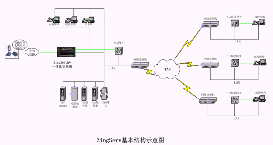 硬件:坐席集中的中心點都有ZingSwitch®交換機,S口網(wǎng)關(guān)和CO8卡或E1接口網(wǎng)關(guān)和E1卡。VPN動態(tài)注冊服務(wù)器和VPN設(shè)備,或GK服務(wù)器。