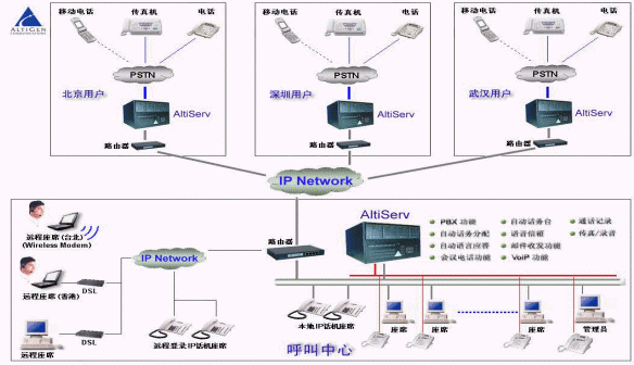 AltiCenter 將奧迪堅(jiān)所倡導(dǎo)的基于IP分布式呼叫中心技術(shù)完美轉(zhuǎn)化為產(chǎn)品,為用戶輕松構(gòu)建基于IP的分布式呼叫中心系統(tǒng)。該呼叫中心不僅提供語(yǔ)音電話,還能提供包括音頻視頻在內(nèi)的多媒體通信;不僅能支持傳統(tǒng)的電話終端,還能支持來(lái)自Internet的語(yǔ)音、數(shù)據(jù)信息等多種交互方式;不僅提供了完整的本地座席功能,還提供遠(yuǎn)程IP座席,遠(yuǎn)程IP專家座席,并提供高度統(tǒng)一實(shí)用的呼叫中心管理體系。AltiCenter在設(shè)計(jì)之初就采用IP內(nèi)核的一體化設(shè)計(jì),不需要任何語(yǔ)音網(wǎng)關(guān)設(shè)備,就可以在網(wǎng)絡(luò)上構(gòu)建一個(gè)語(yǔ)音和數(shù)據(jù)的統(tǒng)一平臺(tái),無(wú)論在世界的哪個(gè)角落,遠(yuǎn)程IP座席和分布的異地機(jī)構(gòu)都可以共享客戶的所有資源(語(yǔ)音、數(shù)據(jù)、座席),由于采用了先進(jìn)的VoIP技術(shù),可以為各地的電話和Internet的客戶提供統(tǒng)一的客戶號(hào)碼和統(tǒng)一的客戶服務(wù),并極大地降低呼叫中心的運(yùn)營(yíng)成本,真正幫助用戶建立一個(gè)高效的、信息共享的分布式呼叫中心系統(tǒng)。