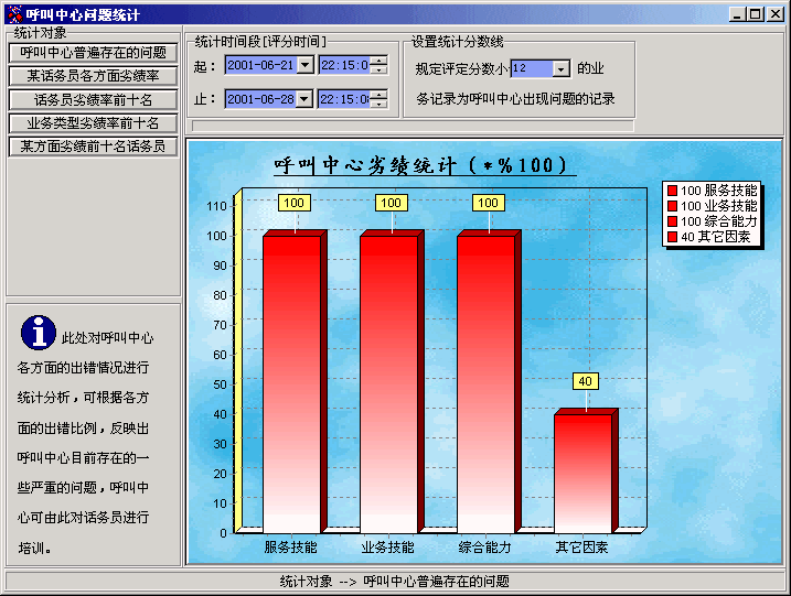 下圖為AP Suite的呼叫中心劣績統(tǒng)計圖,通過此統(tǒng)計可以了解到呼叫中心目前存在的一些問題,從而對話務員進行針對性的培訓。