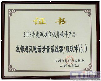 2009年1月,友鄰?fù)ㄓ嶋娫掍浺粝到y(tǒng)客/服軟件V5.0 榮獲由深圳市軟件行業(yè)協(xié)會頒發(fā)的“2008年度深圳市優(yōu)秀軟件產(chǎn)品”榮譽證書。“2008年度深圳市優(yōu)秀軟件產(chǎn)品”的評選是深圳市軟件行業(yè)協(xié)會在全市范圍內(nèi)舉辦的軟件產(chǎn)品推優(yōu)活動,經(jīng)過了企業(yè)申報、技術(shù)資料審核、專家評審等等幾大嚴(yán)格篩選程序。
