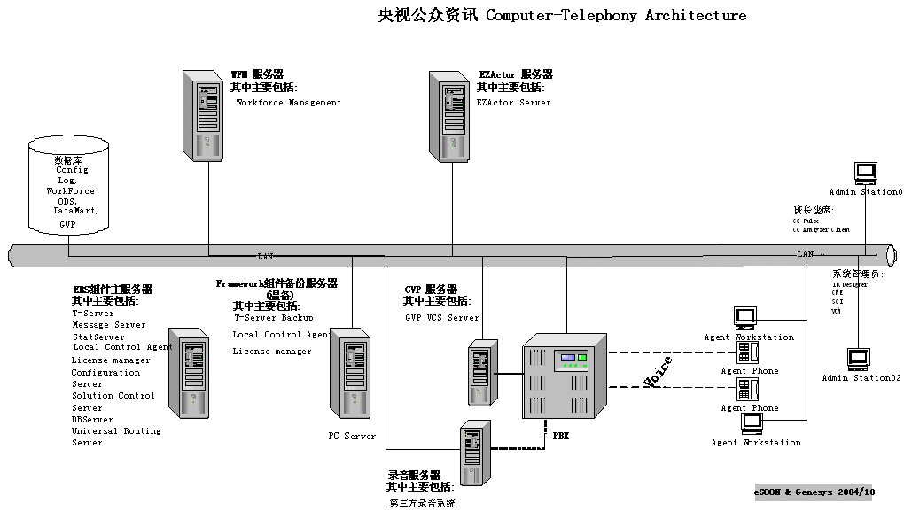 由于簽約時距離2005年春節(jié)聯(lián)歡晚會只有不足2個月的時間,勝利完成春節(jié)聯(lián)歡晚會時的電話服務工作就成為CCTV公眾資訊中心和eSOON的最大目標。因為用戶采用了成熟的eSOON解決方案(CTI-Genesys ERS;IVR-Genesys GVP;CRM-eSOON EZactor),所以整個系統(tǒng)在短短一個月內就完成了上線工作。在經(jīng)過詳細的測試及全面的人員培訓后整個系統(tǒng)經(jīng)受住了春節(jié)聯(lián)歡晚會的考驗,圓滿完成了晚會的電話、短信的支撐工作。徹底擺脫了前幾年系統(tǒng)不堪應付突發(fā)大量呼叫的窘境,提升了CCTV公眾資訊有限公司的服務品質。