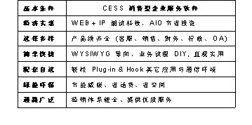 CESS消費(fèi)型服務(wù)軟件具有經(jīng)濟(jì)實(shí)惠、選擇多樣、簡單快捷、配套自選、綠能環(huán)通路廣泛等特點(diǎn),采用Web+IP的潮流科技,AIO節(jié)省投資,使軟件經(jīng)濟(jì)實(shí)惠;CESS軟件產(chǎn)品線齊全,涵蓋客服、銷售、財(cái)務(wù)、行政、OA等很多方面,給您多樣選擇;WYSIWYG(所見即所得)導(dǎo)向,業(yè)務(wù)流程DIY,讓您至需要?jiǎng)觿?dòng)鼠標(biāo)就可以DIY您想要得到的設(shè)計(jì),不再需要麻煩IT人員,只管實(shí)用,簡單快捷;輕松Plug-in & Hook其它應(yīng)用與通信環(huán)境,可根據(jù)您的需要配套自選;節(jié)能減碳、省話費(fèi)、省空間,綠色環(huán)保;經(jīng)銷體系健全、提供優(yōu)質(zhì)服務(wù),通路廣泛。