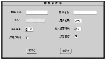 2). 除信箱號碼為必須輸入外,其它各項若不輸入,系統(tǒng)會按缺省值設(shè)置信箱參數(shù)。 3). 設(shè)置完成后按確認(rèn)按鈕即增加一個信箱號碼。若不想增加,按取消按鈕退出。