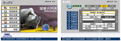 上海IPTV業(yè)務自2006年9月1日放號以來,發(fā)展十分迅速。截止10月7日,上海電信IPTV業(yè)務共計發(fā)展用戶達2.2萬。如下是上海IPTV商用系統(tǒng)EPG頁面: