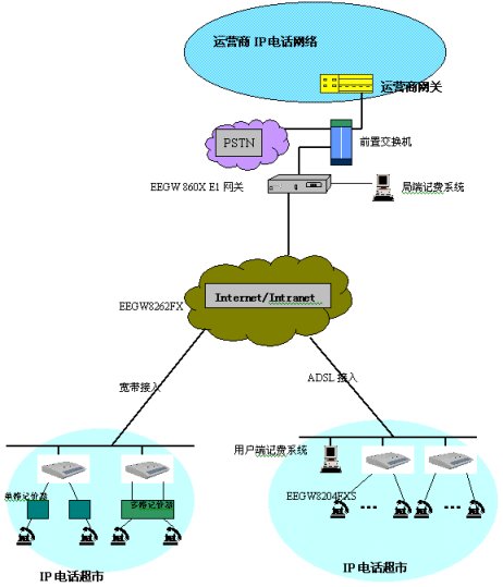EEGW 8204 FXS網(wǎng)關(guān)和EEGW 8262 FXS網(wǎng)關(guān),由RJ45線連接到internet網(wǎng),每臺EEGW 8204 FXS網(wǎng)關(guān)可掛四部電話,每臺EEGW 8262 FXS網(wǎng)關(guān)可掛2部電話。