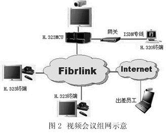 目前視頻會(huì)議系統(tǒng)主要有兩大類:一種基于H.320協(xié)議標(biāo)準(zhǔn),另一種基于H.323協(xié)議標(biāo)準(zhǔn)。H.320會(huì)議系統(tǒng)技術(shù)成熟,運(yùn)行穩(wěn)定,圖像質(zhì)量高,但業(yè)務(wù)功能單一,組網(wǎng)不夠靈活;H.323會(huì)議系統(tǒng)是最近兩年興起的視頻會(huì)議系統(tǒng),運(yùn)行在廣泛存在的IP網(wǎng)絡(luò)之上,以功能豐富、組網(wǎng)方便靈活等為主要特征,成為視頻會(huì)議系統(tǒng)的發(fā)展方向,但其視頻質(zhì)量很大程度上依賴于所承載的IP網(wǎng)絡(luò)的質(zhì)量。中電飛華公司基于FibrLINK平臺,為用戶提供H.320、H.323以及H.320和H.323混合組網(wǎng)的視頻會(huì)議系統(tǒng)建設(shè),如圖2所示。