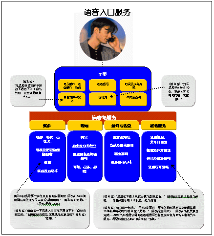 語(yǔ)音網(wǎng)最吸引人之處就在于它可以在一次通話中,同時(shí)處理多個(gè)任務(wù)。下圖表明一名商務(wù)人員是如何安排好與一個(gè)未來(lái)的商務(wù)旅行有關(guān)的一系列任務(wù)的。他獲取了對(duì)自己有用的信息,順利達(dá)成了一項(xiàng)語(yǔ)音商務(wù)交易,接收個(gè)人信息和辦公室的幫助,并撥打電話所有這些都是在一個(gè)同步過(guò)程中完成的。