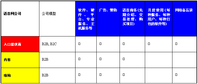 “第一個(gè)吃螃蟹”的公司僅僅注重提供語(yǔ)音入口服務(wù),語(yǔ)音網(wǎng)使這些公司有機(jī)會(huì)通過(guò)電話經(jīng)營(yíng)互聯(lián)網(wǎng)商務(wù)模型。