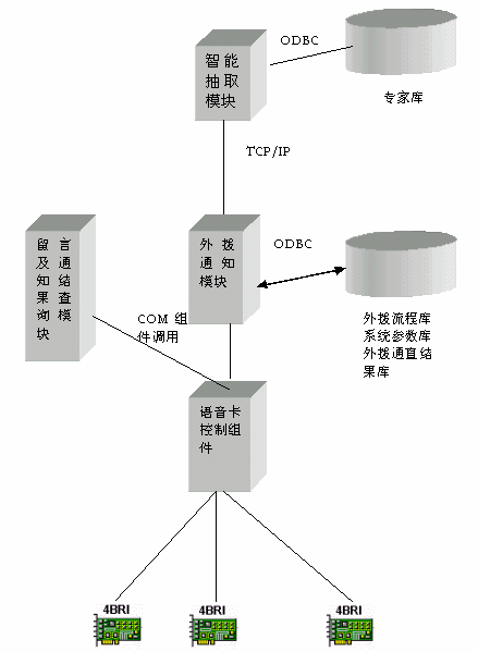 北京市建筑市場(chǎng)專家評(píng)標(biāo)抽取通知系統(tǒng)是靈訊科技有限公司采用加拿大Eicon網(wǎng)絡(luò)公司的Diva Server 4BRI 卡開發(fā)的一套高效的外撥通知系統(tǒng),該系統(tǒng)充分體現(xiàn)了Eicon網(wǎng)絡(luò)公司 Diva Server 4BRI卡強(qiáng)大的語(yǔ)音功能以及系統(tǒng)的穩(wěn)定性,準(zhǔn)確地識(shí)別了外撥手機(jī)的遇忙、無人、不再服務(wù)區(qū)、關(guān)機(jī)、空號(hào)等狀態(tài),實(shí)現(xiàn)了對(duì)手機(jī)狀態(tài)的全面監(jiān)控,全面解決了模擬語(yǔ)音卡對(duì)外撥手機(jī)信號(hào)無法判斷的問題。具體的系統(tǒng)架構(gòu)如下:![]()