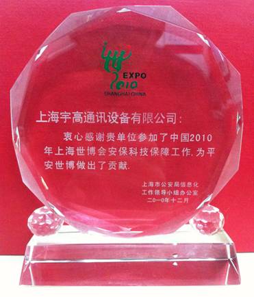 宇高通訊榮獲“2010世博安保貢獻獎”