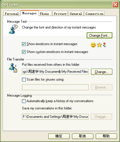Messenger 6.0必須在個人選項(xiàng)中進(jìn)行設(shè)置后才可以自動保存聊天記錄,默認(rèn)是不支持的。