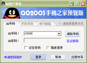 登陸方式在登陸方式上,QQ 2003進(jìn)行大的改變。由于QQ號碼位數(shù)的增加,有的QQ號碼已經(jīng)達(dá)到了九位非常難記,QQ 2003則增加手機(jī)號碼和Email登錄方式,通過手機(jī)和Email與QQ的綁定,可以輕松的通過電子郵件和手機(jī)號碼登陸。MSN