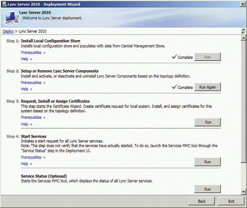準備好基礎(chǔ)結(jié)構(gòu)并發(fā)布拓撲后,即可開始安裝前端服務(wù)器和服務(wù)器角色,以啟用 A/V 會議、企業(yè)語音、監(jiān)控、存檔及其他功能。準備每臺服務(wù)器從運行部署向?qū)В▍⒁妶D 3)開始,但每個服務(wù)器角色都有自己的安裝和配置要求。您可以在 TechNet 庫的“部署 Lync Server 2010 Standard Edition”部分查找更多詳細信息。