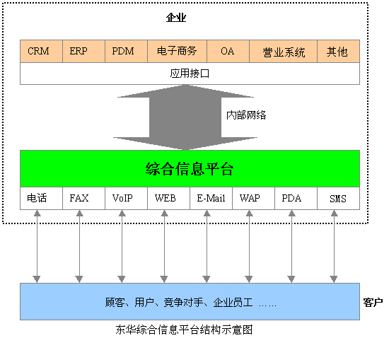 東華集團綜合信息平臺系統(tǒng)可集中企業(yè)客戶服務的優(yōu)勢資源,采用人工業(yè)務代表服務與自動語音服務相結合的形式,通過電話、Email、Web、尋呼、IP電話/傳真、視頻、段消息等接入方式和服務手段,向客戶提供業(yè)務受理、信息查詢、商品定購服務,以及接受客戶的咨詢、建議及投訴,也可以通過主動撥出做社會調查、市場調查、商品直銷及資費欠費催繳等。