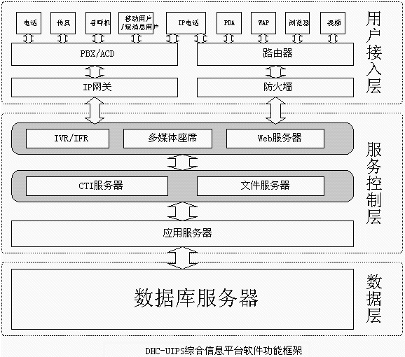 即DHC-UIPS綜合信息平臺的接入端,包括IVR流程、人工坐席等,它是用戶進入多媒體客服中心客服系統(tǒng)的入口,它將直接面對用戶并收集各種信息。支持電話、傳真、電子郵件、WEB訪問、WAP、PDA、IP電話、網絡電話、視頻電話等多種方式接入。