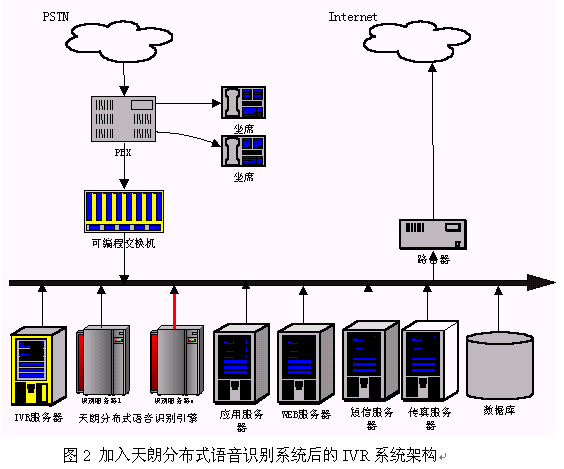 硬件連接:天朗分布式語音識別系統(tǒng)是通過局域網(wǎng)來把客戶端和服務器連在一起。因此在硬件上把天朗分布式語音識別系統(tǒng)聯(lián)入到IVR的一種簡單的辦法是把引擎的所有服務器接入到系統(tǒng)現(xiàn)有的局域網(wǎng)中,使得識別服務器能和IVR服務器通過TCP/IP通訊即可。連接后的系統(tǒng)架構(gòu)可以用圖2來表示。
