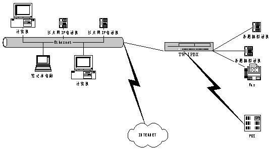 在一個(gè)有很多分支機(jī)構(gòu)的大企業(yè)的分部安裝Tw-IPBX ,通過(guò)IP 網(wǎng)絡(luò)與企業(yè)總部PBX 連接后后,可實(shí)現(xiàn)多種應(yīng)用,同時(shí)降低了成本。在這種應(yīng)用場(chǎng)景中,采用了基于IP 的傳輸機(jī)制(VoIP)。此種情況下VoIP的美好之處在于語(yǔ)音和數(shù)據(jù)的IP 傳輸管路需求(根據(jù)呼叫)的無(wú)縫可伸縮性,而無(wú)需任何靜態(tài)的分區(qū),這種解決方案可提供性能價(jià)格比極高且靈活的網(wǎng)絡(luò)運(yùn)作。