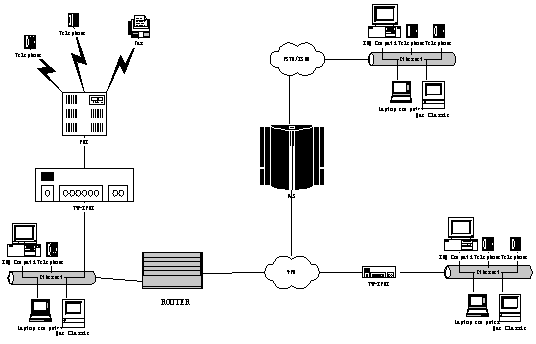 該應(yīng)用示意圖具有一個(gè)(iPBX )或多個(gè)辦公場(chǎng)地(nIPBX - 組網(wǎng)iPBX )提供電話(huà)系統(tǒng)解決方案。該解決方案是基于IP 電話(huà)技術(shù)而構(gòu)建的Tw-IPBX “一體化概念”,同時(shí)可提供傳統(tǒng)的模擬電話(huà)概念,如模擬電話(huà)和傳真機(jī)。以下敘述了客戶(hù)機(jī)組合的單獨(dú)應(yīng)用場(chǎng)景,包括: