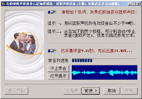 提示:如果原來已經(jīng)提取過該用戶的聲紋信息,且在"聲紋信息的提取"步驟一的窗口上不點擊"提取聲紋"而直接點擊"前進"按鈕,將使用舊的聲紋信息,而僅更新"錄音音量"和"嚴格程度閾值"的設(shè)置。