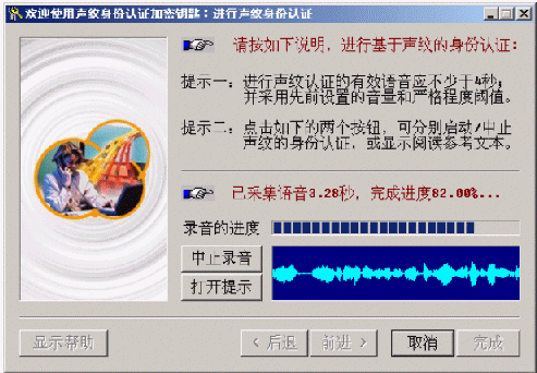 在彈出的窗口中輸入用戶名并點擊"語音身份認證"按鈕,從彈出窗口中點擊"聲紋認證"按鈕,根據(jù)系統(tǒng)提示,對著麥克風說出含有4秒以上有效語音的任意一段話,讓系統(tǒng)進行聲紋身份認證。如果被拒絕,系統(tǒng)會顯示一個對話框,提示用戶選擇是繼續(xù)嘗試,還是放棄;如果通過,則系統(tǒng)會自動打開用戶的私有加密文件目錄。