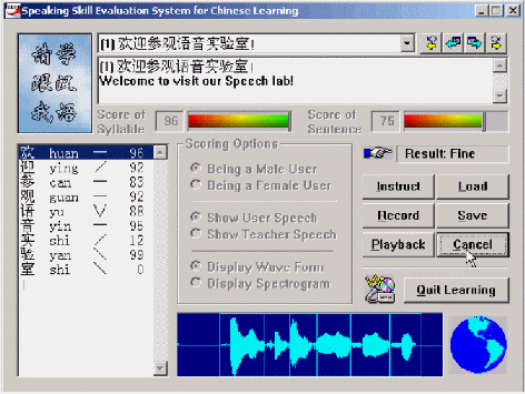 "得意"口語(yǔ)學(xué)習(xí)系統(tǒng)的原理是基于語(yǔ)音音素及其他參數(shù)的提取與分割,將使用者的語(yǔ)音音素系列與標(biāo)準(zhǔn)模型的語(yǔ)音音素序列進(jìn)行自動(dòng)比對(duì),并將比對(duì)結(jié)果通過(guò)視圖形象而直觀地給出,從而對(duì)學(xué)習(xí)者的語(yǔ)音給出恰當(dāng)?shù)脑u(píng)價(jià)(比如對(duì)每個(gè)音素給出一個(gè)得分等),以幫助其改進(jìn)和提高口語(yǔ)發(fā)音,使其接近或達(dá)到語(yǔ)音的標(biāo)準(zhǔn)水平。由于利用可視化的朗讀評(píng)分等人機(jī)交互的方式,而且通過(guò)視覺(jué)、聽(tīng)覺(jué)等綜合手段,反復(fù)提示和幫助用戶(hù)接近標(biāo)準(zhǔn)發(fā)音,因而顯著提高了學(xué)習(xí)者的學(xué)習(xí)興趣,這對(duì)提高英語(yǔ)學(xué)習(xí)成績(jī)有很多幫助。
