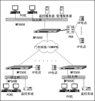 各分店用一臺(tái)MP2500路由器,配雙以太口,一個(gè)口接MP5008交換機(jī)組建本地以太網(wǎng),一個(gè)口接廣電的10MVPN,以實(shí)現(xiàn)本地以太網(wǎng)與總店、各分店、配送中心等連接。配1個(gè)RM2-1VoIP單路IP電話模塊,直接下掛普通電話機(jī),以實(shí)現(xiàn)全網(wǎng)IP電話免費(fèi),同時(shí)還可以通過總店的程控交換機(jī)與市話連接。分店以太網(wǎng)中,掛有監(jiān)控系統(tǒng)、PC機(jī)、醫(yī)保讀卡器等。模塊化設(shè)計(jì)提供了網(wǎng)絡(luò)擴(kuò)展的空間,滿足未來業(yè)務(wù)的發(fā)展。邁普的路由器提供多種模塊,用戶可以根據(jù)實(shí)際需要加裝不同的模塊,滿足不同環(huán)境的使用要求。模塊化設(shè)計(jì)可以極大地方便設(shè)備的維護(hù),并為今后的網(wǎng)絡(luò)升級(jí)改造提供足夠的預(yù)留空間。