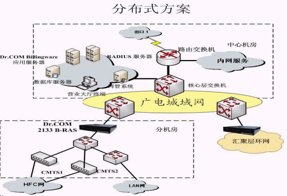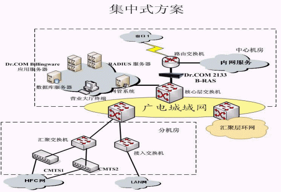 根據(jù)廣電城域網(wǎng)目前網(wǎng)絡(luò)的規(guī)模,以及以后的擴展,采用集中接入認(rèn)證與計費,統(tǒng)一管理的方案,集中接入指:接入服務(wù)器部署在各個匯聚層的匯聚點,即在網(wǎng)絡(luò)出口安裝寬帶接入服務(wù)器,由寬帶接入服務(wù)器對所有用戶進行身份認(rèn)證、接入控制、實時計費、數(shù)據(jù)采集,并將賬單和訪問日志等傳送至綜合業(yè)務(wù)系統(tǒng)。統(tǒng)一管理指在中心機房就可以進行全部的管理,包括:網(wǎng)絡(luò)設(shè)備管理;用戶管理;經(jīng)營策略管理;賬務(wù)管理;安全管理;數(shù)據(jù)分析。提供完整的用戶資料分析,使用習(xí)慣分析,運營統(tǒng)計等詳細分析報表。