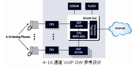 圖1:AudioCodes的片上應(yīng)用方案:4-16信道VoIP網(wǎng)關(guān)參考設(shè)計