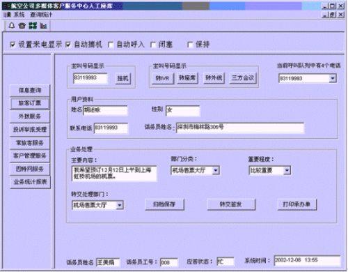 。。客戶打入電話后,當(dāng)系統(tǒng)的自動語音應(yīng)答子系統(tǒng)無法解決客戶問題時,客戶可選擇人工服務(wù),由航空公司客戶服務(wù)代表直接接聽客戶電話,處理并解決客戶問題。此時客戶同座席話務(wù)人員直接溝通,并同時記錄下該客戶的聯(lián)系方式,將相關(guān)數(shù)據(jù)添加入系統(tǒng)數(shù)據(jù)庫;也可以在數(shù)據(jù)庫的支持下回答機場航班/航空貨運信息及相關(guān)規(guī)定等的咨詢和疑問、訂座/訂艙?蛻粢部梢赃x擇自動語音服務(wù)方式,根據(jù)系統(tǒng)的語音提示輸入按鍵,選擇類別,將自己的投訴和建議以及自己的聯(lián)系方式信息以留言錄音的方式保存在系統(tǒng)中。系統(tǒng)同時還支持自動傳真方式,客戶可以通過傳真機進(jìn)入本系統(tǒng),通過按鍵選擇傳真方式,將自己的意見建議等的文本內(nèi)容傳真給系統(tǒng),系統(tǒng)自動接受并存入數(shù)據(jù)庫。