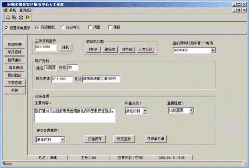。。系統(tǒng)通過計算機語音自動應(yīng)答設(shè)備或人工座席與患者建立聯(lián)系,檢索業(yè)務(wù)數(shù)據(jù)庫,既可以直接播放病人所需的咨詢信息、醫(yī)療費用明細(xì)查詢、遠(yuǎn)程就診掛號,又可以接受患者的投訴舉報或求助,向醫(yī)院相關(guān)科室或負(fù)責(zé)人轉(zhuǎn)交相應(yīng)投訴建議或求助信息,使問題能夠在最快的時間內(nèi)得到最好的解決,這種交互式的服務(wù)模式和服務(wù)手段保證了溝通的靈活性和高效性,提高了患者對醫(yī)院的滿意度和信任度。